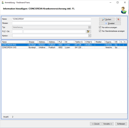 In der nächsten Maske wird die Versicherung als Kontakt erfasst. In der Regel wird dabei keine neue Adresse erfasst, weil die Versicherung bereits im System ist. Im Namensfeld der Suche ist der Name vorbelegt, wie die Versicherung von der Spitalanmeldung eingegeben worden ist. Hier ist womöglich die Suche so anzupassen, so dass die passende Versicherung effektiv gefunden werden kann. Falls die Versicherung nicht im System vorhanden ist, kann diese auch neu angelegt werden.