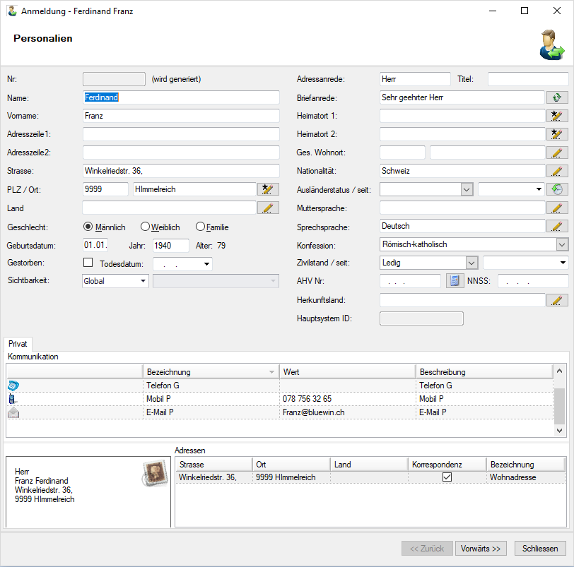 Sind alle Daten erfasst, gelangt man mittels Button Vorwärts >> zur nächsten Maske.