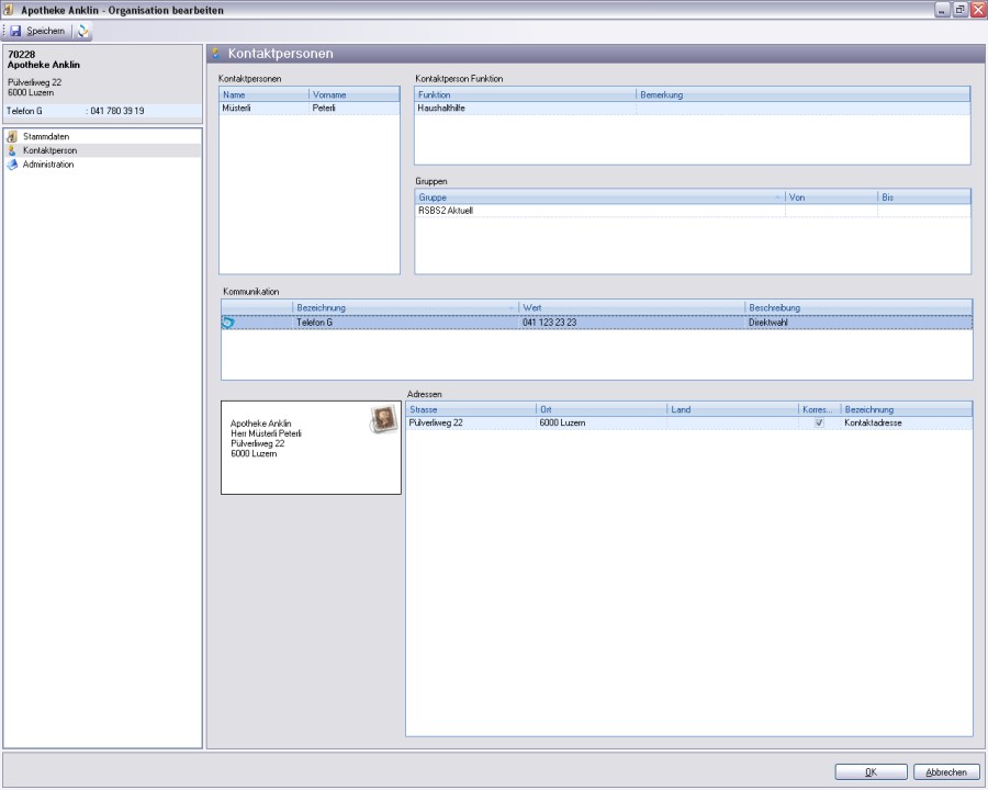 En ce qui concerne les contacts, ceux-ci sont montrés pour ce client. Toutes les relations avec d'autres personnes/organisations sont représentées. A l'enregistrement d'un contact, il faut choisir son adresse dans les adresses existantes de asebis®.