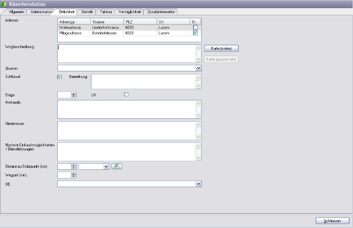 Sous l'onglet „Localité", vous trouvez toutes les informations importantes concernant le domicile des clients.