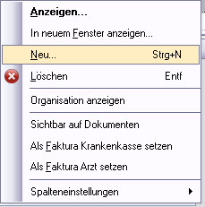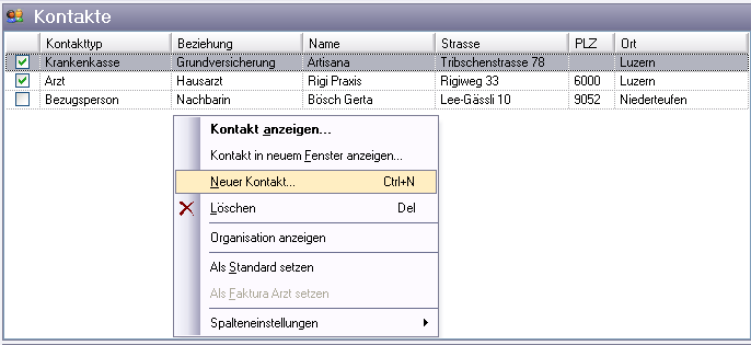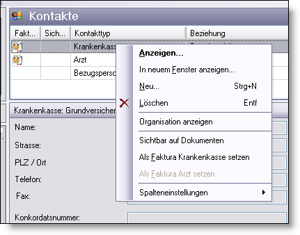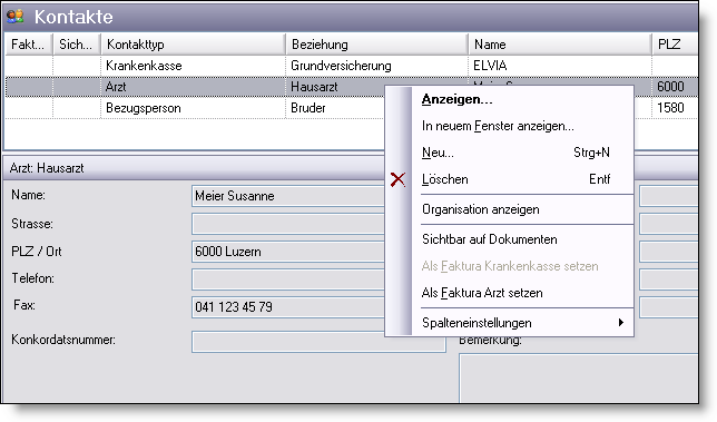 Dans le menu contextuel, vous pouvez définir „définir comme standard" pour les Assureurs maladie et „définir comme médecin standard". Si ceux-ci ont des entrées similaires pour l'ensemble des données, il est nécessaire de les imprimer. Le médecin standard, respectivement l'assureur maladie, est représenté avec un symbole correspondant.