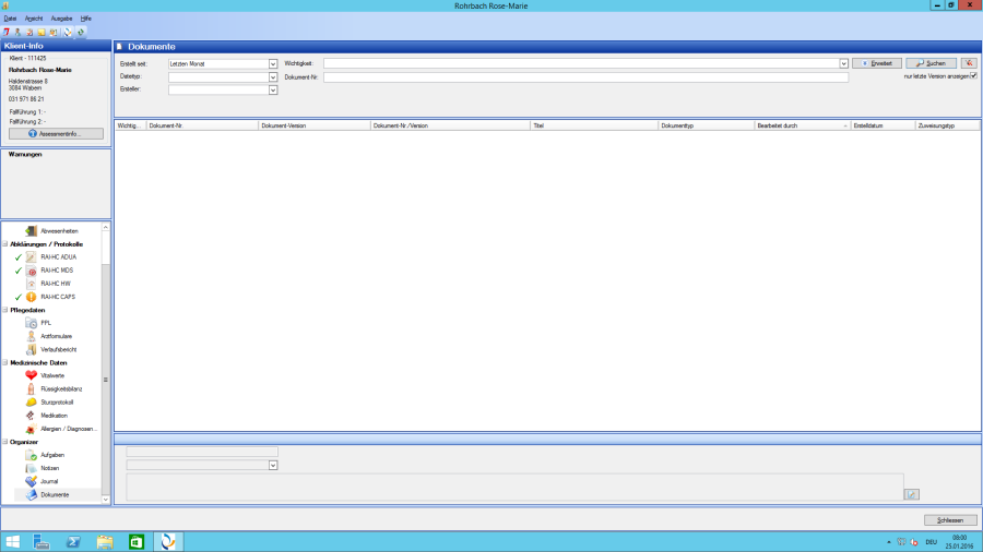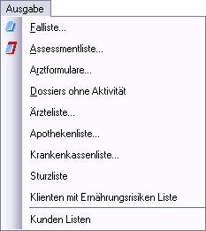 Vous pouvez trouver en sélectionnant, les évaluations qui se rapportent à tous les fichiers dans le masque principal asebis® du module dossier soins. Puis dans le menu de sortie toutes les analyses disponibles y sont affichées.