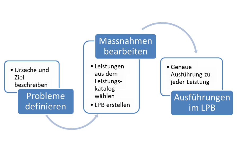 Durch die Bestimmung von Ursache und Ziel, können Sie nun Massnahmen, also Leistungen zur Pflege des Problems definieren.