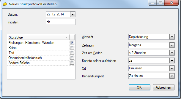 Erfassen Sie das Datum und Ihre Initialen. Wählen Sie die Sturzfolgen und dokumentieren Sie den Sturz so genau wie möglich mit den Auswahlmöglichkeiten der Felder im rechten Bereich.