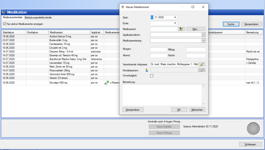 Im unteren Bereich gibt es die Kontrolle nach dem 4-Augen Prinzip. Sobald Anpassungen an der Medikation getätigt worden sind, muss diese neu geprüft werden. Der Mitarbeiter, welcher ein Medikament geändert hat, drückt auf den Button «Visum Ersteller». Ein Teamleiter oder andere Fachperson prüft die Anpassungen und drückt dann den Button «Visum Prüfung». Anscheinend wird die Warnlampe grün.