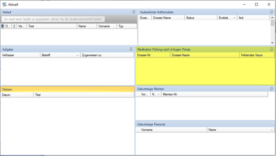 Im Fenster Aktuell werden Klienten aufgelistet, welche das «Visum Ersteller» haben und eine Prüfung notwendig ist. Die Klienten erscheinen im Aktuell, wenn: