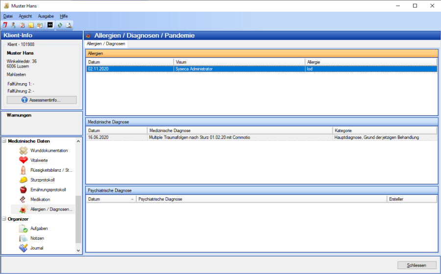 Es ist grundsätzlich möglich, medizinische Daten auch wieder zu löschen. Bedenken Sie jedoch, dass Sie mit dem Löschen eines Datensatzes auch eine spätere Nachvollziehbarkeit verunmöglichen. Aus diesem Grund empfiehlt es sich, einmal erfasste Daten nicht mehr zu löschen.