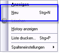 Um eine neue Bestellung zu erfassen wählen Sie Neu aus dem Kontextmenü aus.