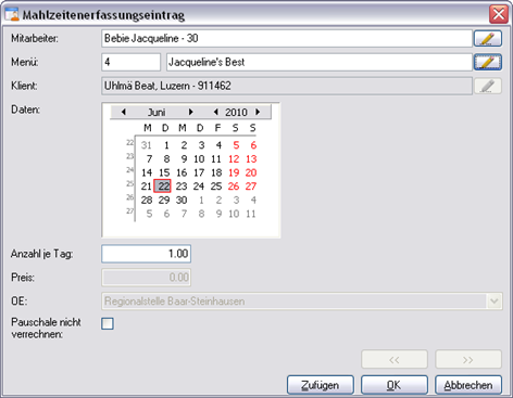 In diesem Bereich werden die einzelnen Organizer-Elemente erfasst, aufs Dossier Mahlzeiten bezogen.