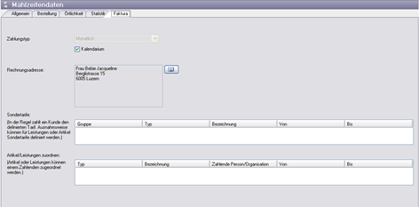 | Artikel/Leistungen zuordnen | Normalerweise werden die Rechnungen an die Rechnungsadresse gestellt. In diesem Bereich können Sie einzelne Menüs festlegen, welche, abweichend von der Rechnungsadresse, an einen anderen Rechnungsempfänger verrechnet werden. |