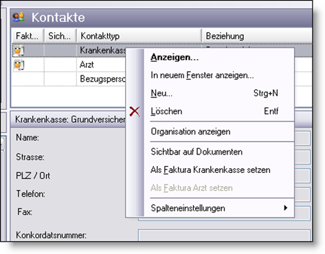 Über das Kontextmenü können Sie für Krankenkassen (als Standard setzen) und für die Arztadressen (als Faktura Arzt setzen) festlegen, dass bei mehreren gleichartigen Einträgen dieser Datensatz als Standarddatensatz auf dem Deckblatt des Kunden gedruckt werden soll. Der so definierte Standardarzt, bzw. -krankenkasse wird mit einem entsprechenden Symbol dargestellt.