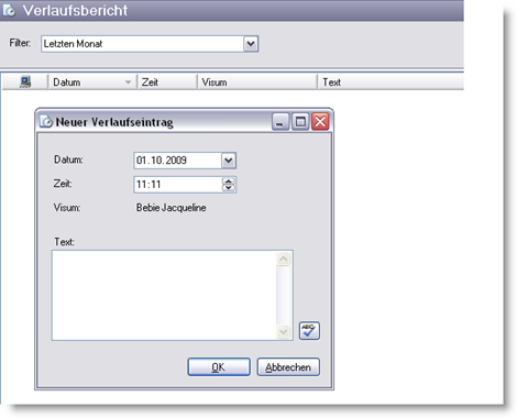 Über das Kontextmenü geben Sie einen neuen Verlaufseintrag ein. Bestehende Verlaufseinträge können sie anzeigen, als gelesen oder als ungelesen markieren.