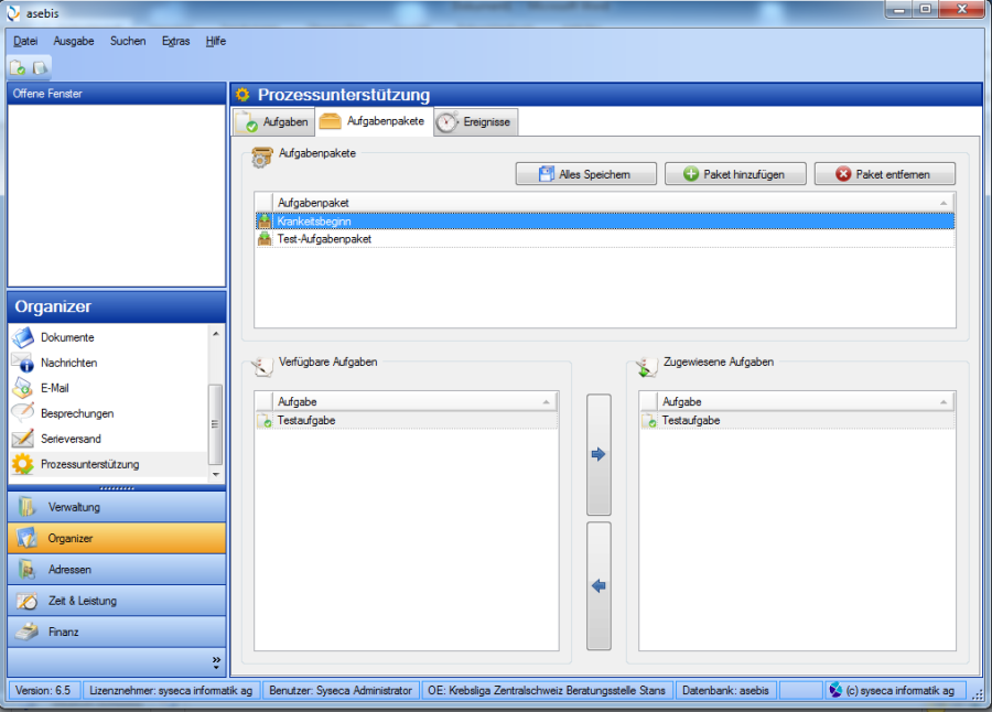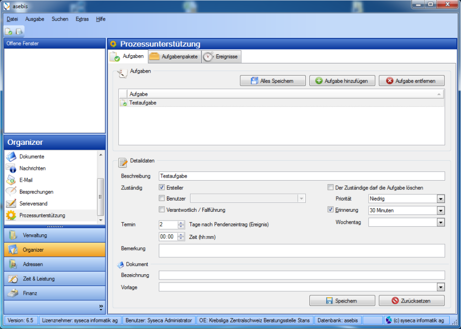 Die Prozessunterstützung ermöglicht das automatische Erstellen von Aufgaben bzw. Aufgabenpaketen, ausgelöst durch ein bestimmtes Ereignis (z.B. das Eröffnen eines Dossiers). Dieses Modul kann nur in Zusammenhang mit Dossier Beratung genutzt werden.