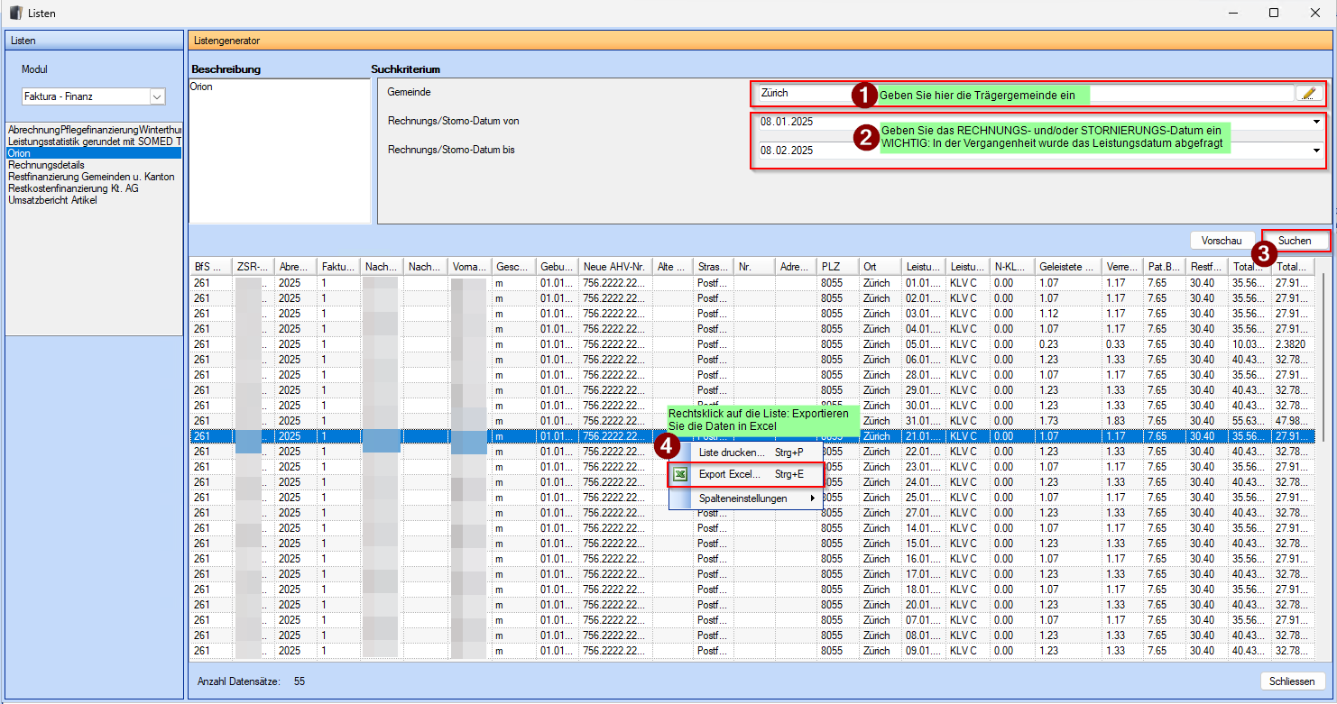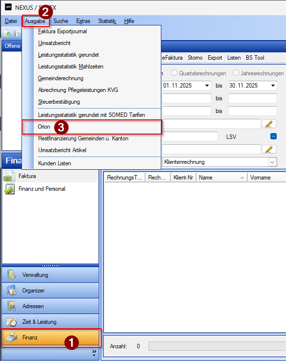 Ab Januar 2026 können Sie Ihre Auswertungen für die Restfinanzierungs-Abrechnung (Orion) direkt aus der NEXUS SPITEX Anwendung erstellen. Die entsprechende Liste wird Ihnen durch unser Support-Team eingerichtet - melden Sie sich bei Bedarf unter support@nexus-schweiz.ch .