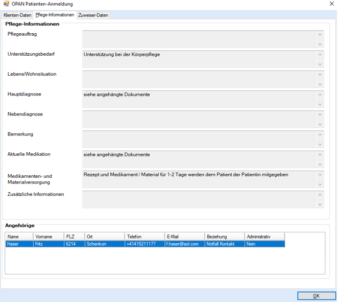 • Angehörige/Bezugsperson (ersichtlich unter «El. Patientenanmeldung» - in den Details unter «Pflege-Informationen». Daten können bei der Neuanlage des Klienten verwendet werden.