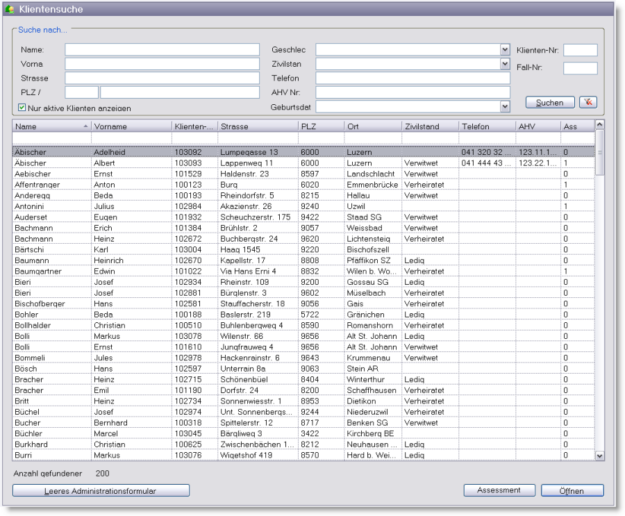 Definieren Sie die Selektionskriterien für die Klientensuche und wählen Sie Suchen.