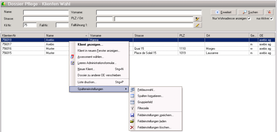 In allen Suchmasken von Nexus Spitex kann eine zusätzliche Filterspalte angezeigt werden. Rufen Sie diese über das Kontextmenü Spalteneinstellungen, Filterzeile auf.
