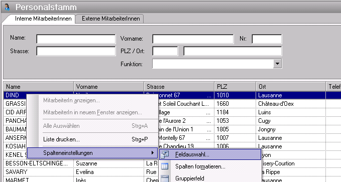 Bei den Listen können Sie Spalten hinzufügen oder entfernen. Über das Kontextmenü Spalteneinstellungen, Feldauswahl fügen Sie zusätzliche Spalten ein.