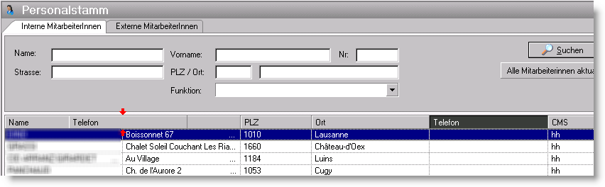 Klicken Sie nun auf die Spalte, über welche die Sortierung erfolgen soll. (z. B. nach dem Ort). Anhand der Symbole (absteigend) und (aufsteigend) sehen Sie, in welcher Sortierung die Daten angezeigt werden.