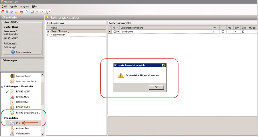 Solange bei einem bestehenden Assessment das Leistungsplanungsblatt noch nicht geschlossen ist, kann dieses bearbeitet werden, obwohl PPL aktiv ist. Ab dem Erzeugen eines neuen Assessments, erscheint nur noch die PPL, es ist kein Mix aus Arbeiten mit PPL und/oder Arbeiten mit Leistungsplanungsblatt möglich.