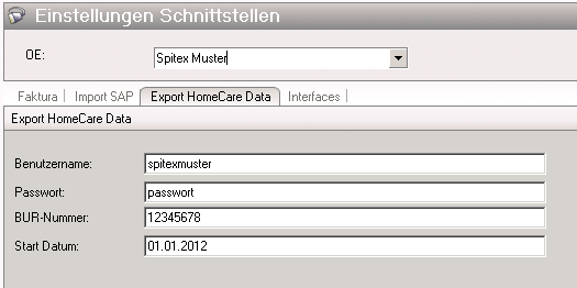 Die Parametrierung der Schnittstelle erfolgt in NEXUS / SPITEX® Administration unter Schnittstellen – Export HomeCareData.