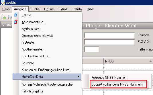 Im Dossier Pflege unter "Ausgabe – HomeCareData" wird der Bericht "Doppelt vorhandene NNSS Nummern" aufgerufen. Dieser zeigt doppelt vorhanden NNSS-Nummern (AHVN13). Diese müssen vor dem Export bereinigt werden.