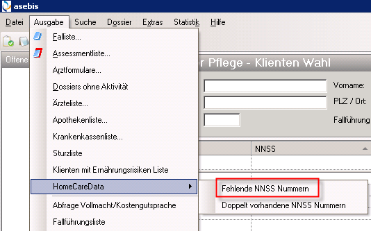 Im Dossier Pflege unter "Ausgabe – HomeCareData" wird der Bericht "Fehlende NNSS Nummern" aufgerufen. Dieser zeigt die Dossier Pflege mit fehlender NNSS-Nummer (AHVN13), welche für den Export notwendig sind. Diese müssen vor dem Export von HomeCareData erfasst werden.