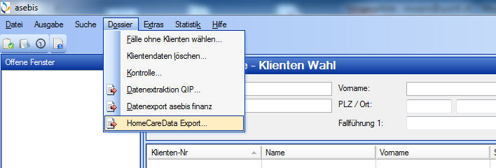 Falls die Prüfung der Datenqualität stattgefunden hat, kann anschliessend der Export gestartet werden. Der Export wird im Dossier Pflege unter "Dossier – HomeCareData Export" gestartet.