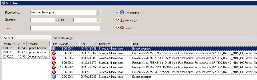Die Fehler werden dann unter Protokoll aufgelistet. Die Fehler müssen dann bei den einzelnen Dossier Pflege korrigiert werden und die Schnittstellen nochmals gestartet werden.