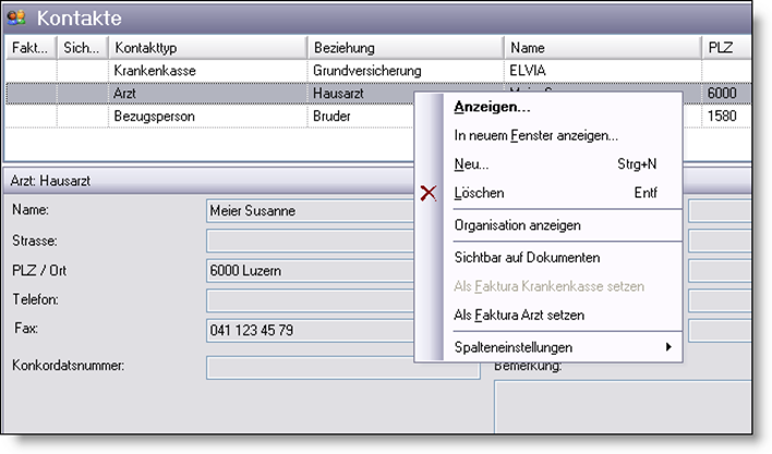 Über das Kontextmenü können Sie für Krankenkassen (als Standard setzen) und für die Arztadressen (als Faktura Arzt setzen) festlegen, dass bei mehreren gleichartigen Einträgen dieser Datensatz als Standarddatensatz auf dem Deckblatt des Kunden gedruckt werden soll. Der so definierte Standardarzt, bzw. -krankenkasse wird mit einem entsprechenden Symbol dargestellt.