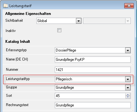 Die Leistungstarife sind im Katalog Leistungstarif erfasst. Im Auswahlfeld Leistungstariftyp ist definiert, um welchen Typen es sich handelt. Falls Sie nicht sicher sind, ob und allenfalls was Sie bei der Zuweisung in der Statistik auswählen sollen, überprüfen Sie diese Definition.