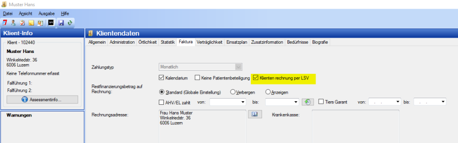 Bei den entsprechenden Klienten, welche die Rechnung per LSV Einzug erhalten möchten, muss die Option bei den Stammdaten angewählt werden:
