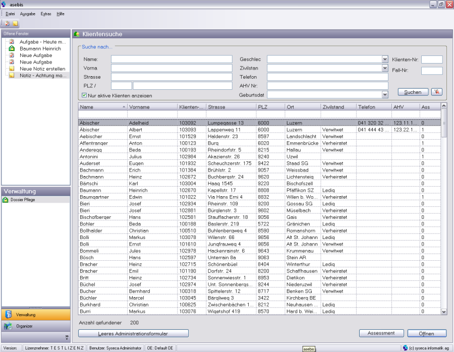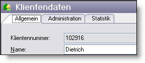 Die Darstellung von Daten erfolgt teilweise in unterschiedlichen Registern. So werden beispielsweise die Klientendaten in die Register Allgemein, Administration, Statistik unterteilt.