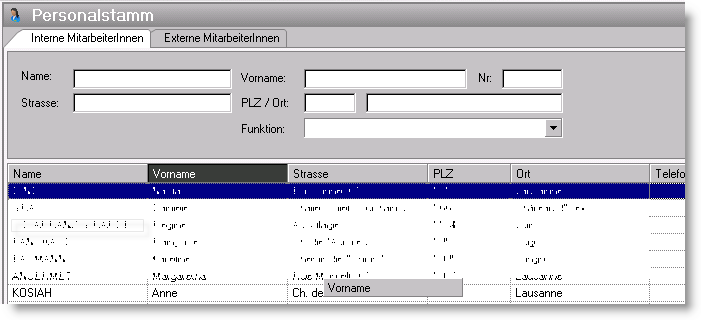 Das Suchergebnis können Sie noch weiter einschränken. Klicken Sie in die gewünschte Spalte in der ersten Zeile der Tabelle und ergänzen Sie diese mit dem Suchkriterium (z. B. dem Vornamen).