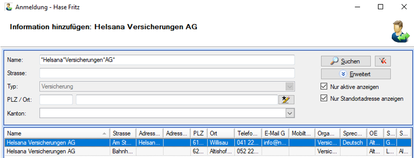 Mit Klick auf «OK» kann der Eintrag gespeichert werden und steht im nächsten Schritt für die Neuanlage des Klienten zur Auswahl zur Verfügung: