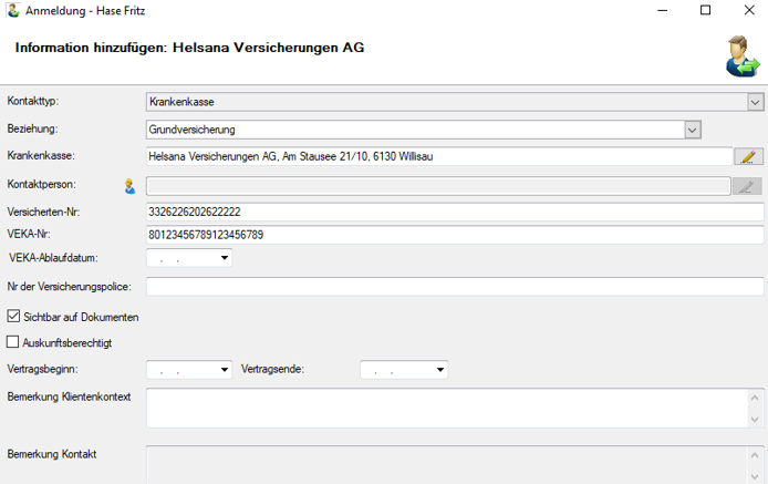 Nach Auswahl der Versicherung, gelangen Sie im nächsten Schritt zur Eingabemaske der spezifischen Daten zu dem neu anzulegenden Klienten.