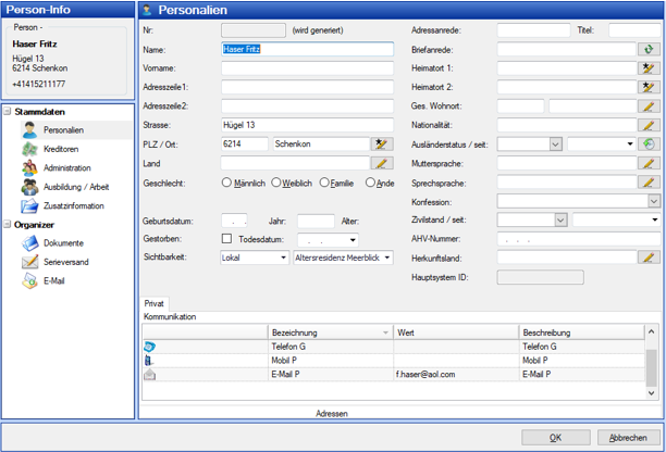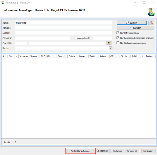 Der Button «Kontakt hinzufügen» erscheint nur, wenn in OPAN die Adresse, Telefon und/oder E-Mailadresse der Kontaktperson vorhanden sind.