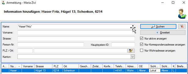 - Wird bei der Übernahme des Klienten festgestellt, dass bereits ähnliche Einträge im Bereich «Person» vorhanden sind, erscheint eine Hinweismeldung: