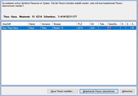 Daraufhin können Sie entscheiden, ob eine «Neue Person» erstellt oder die «Bestehende Person» übernommen werden soll.