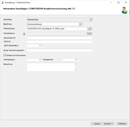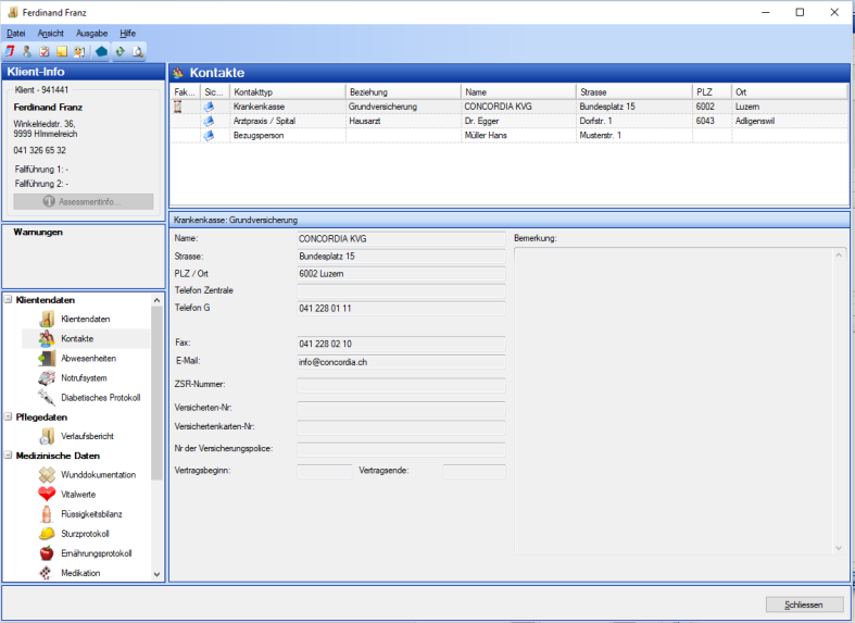 Bei den Kontakten sind Versicherung, Arzt und Kontaktperson hinterlegt: