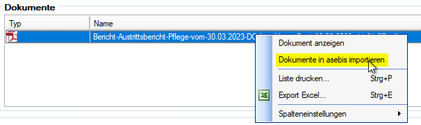 Wenn Ihnen das Spital einen Überweisungsrapport übermittelt hat, wird dies in der Spalte Ü-R mit dem pdf-Symbol angezeigt. Mit Rechtsklick auf eine Anmeldung können Sie den Überweisungsrapport direkt ins Dossier des Klienten als Organizer-Dokument importieren.