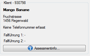 Im linken oberen Bereich der Klientenmaske werden die wichtigsten Daten des Klienten (Klientennummer, Vor-und Nachname, Adresse, Telefonnummer) aus den Stammdaten und aus den vorhandenen Assessments angezeigt