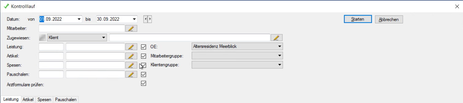 Filtern Sie die Daten, die Sie kontrollieren wollen, nach den gewünschten Kriterien und wählen Sie Starten, um den Kontrolllauf zu starten. Nach erfolgtem Kontrolllauf werden die Leistungen, welche eine Unregelmässigkeit enthalten, in der Liste angezeigt. Alle Leistungen, die in der Kontrolle keine Unregelmässigkeiten enthalten, werden mit einem grünen Hacken markiert.