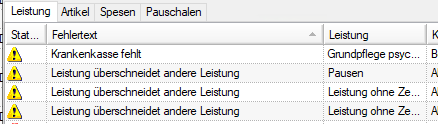 Meldungen mit einem Warnhinweis enthalten eine Unregelmässigkeit, die Sie bearbeiten müssen. Falls Sie entscheiden, dass eine Leistung mit einer Warnung unverändert weiterbearbeitet werden soll, können Sie diese über das Kontextmenü auf den Status akzeptiert setzen. Der Datensatz wird dadurch mit