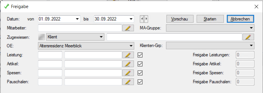 Definieren Sie die Filterkriterien nach Ihren Wünschen. Durch Drücken der Schaltfläche Vorschau wird in den unteren Feldern angezeigt, wie viele Leistungen, Artikel und Spesen für die Freigabe vorbereitet sind. Durch Starten beginnt die Freigabe. Der Status der Verrechnung und des Lohnes wechseln von Nicht freigegeben auf Freigegeben.
