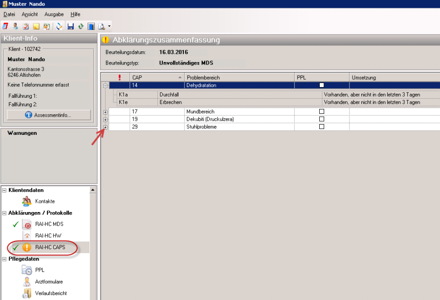 Durch das Ausfüllen des RAI-HC MDS, werden die CAPS (Abklärungshilfen) generiert. Sobald Sie während oder nach dem Ausfüllen des MDS speichern wählen, werden die CAPS erzeugt.