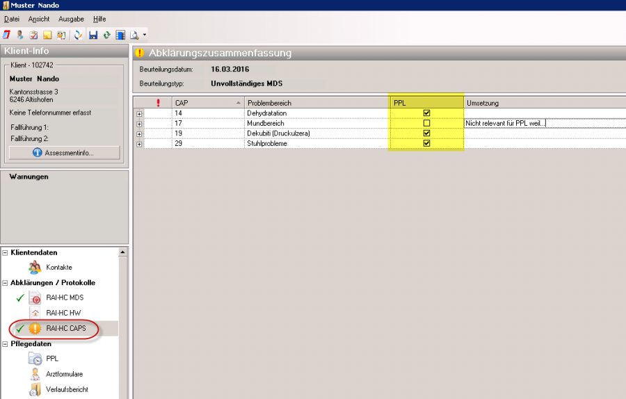 Aktivieren Sie die CAPS in der Spalte „PPL" welche Sie für die Pflegeplanung verwenden möchten.