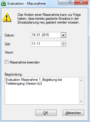 Si vous sélectionnez l'option Terminer les mesures, la mesure est masquée dans la planification des prestations par la date que vous avez saisie. La mesure n'est pas supprimée, mais elle est inactive et ne doit plus être prise en compte dans la feuille de planification des soins / prescription médicale. Enregistrez l'entrée en cliquant sur OK.