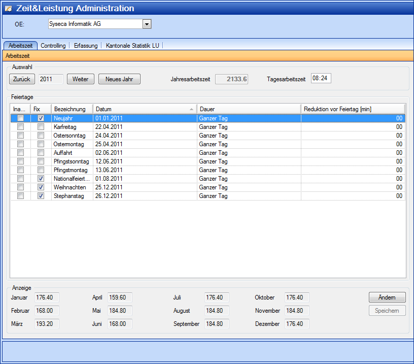 Prüfen Sie die Angaben für die Feiertage und nehmen Sie via Kontextmenü gegebenenfalls Änderungen vor. (z.B. Anpassung des Datums) | ||