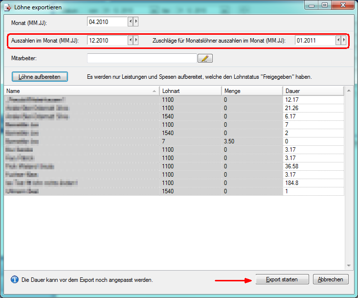 Exportieren Sie nacheinander die noch fehlenden Lohndaten der einzelnen Monate in den gewünschten Auszahlungsmonat: